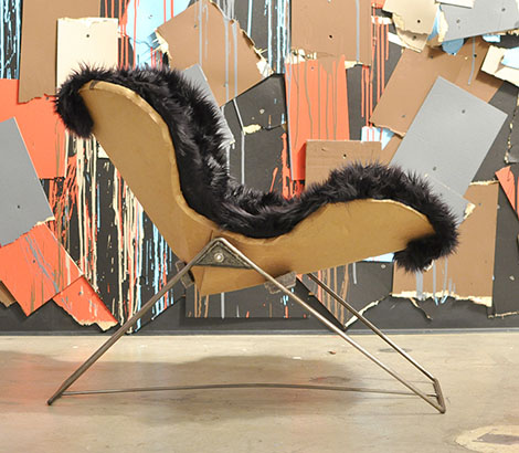 The recliner – redesigned from the box up. Boxes are collected, stacked, cut, laminated, molded and folded into a strong, comfortable shell. A triangular steel base allows the chair to rock and recline.
